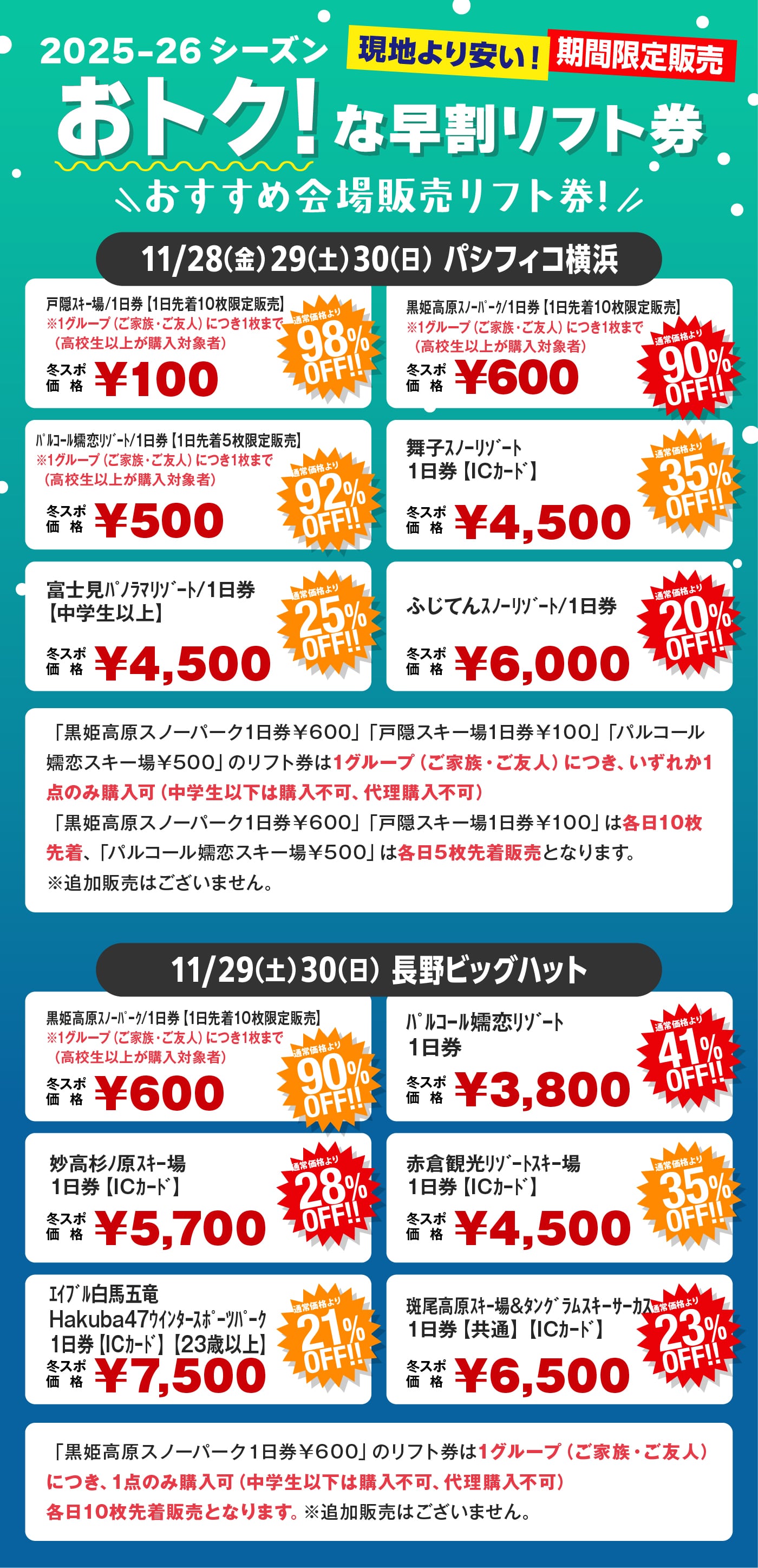 - 完売告知は会場内リフト券売場のみとなりますので、予めご了承ください。