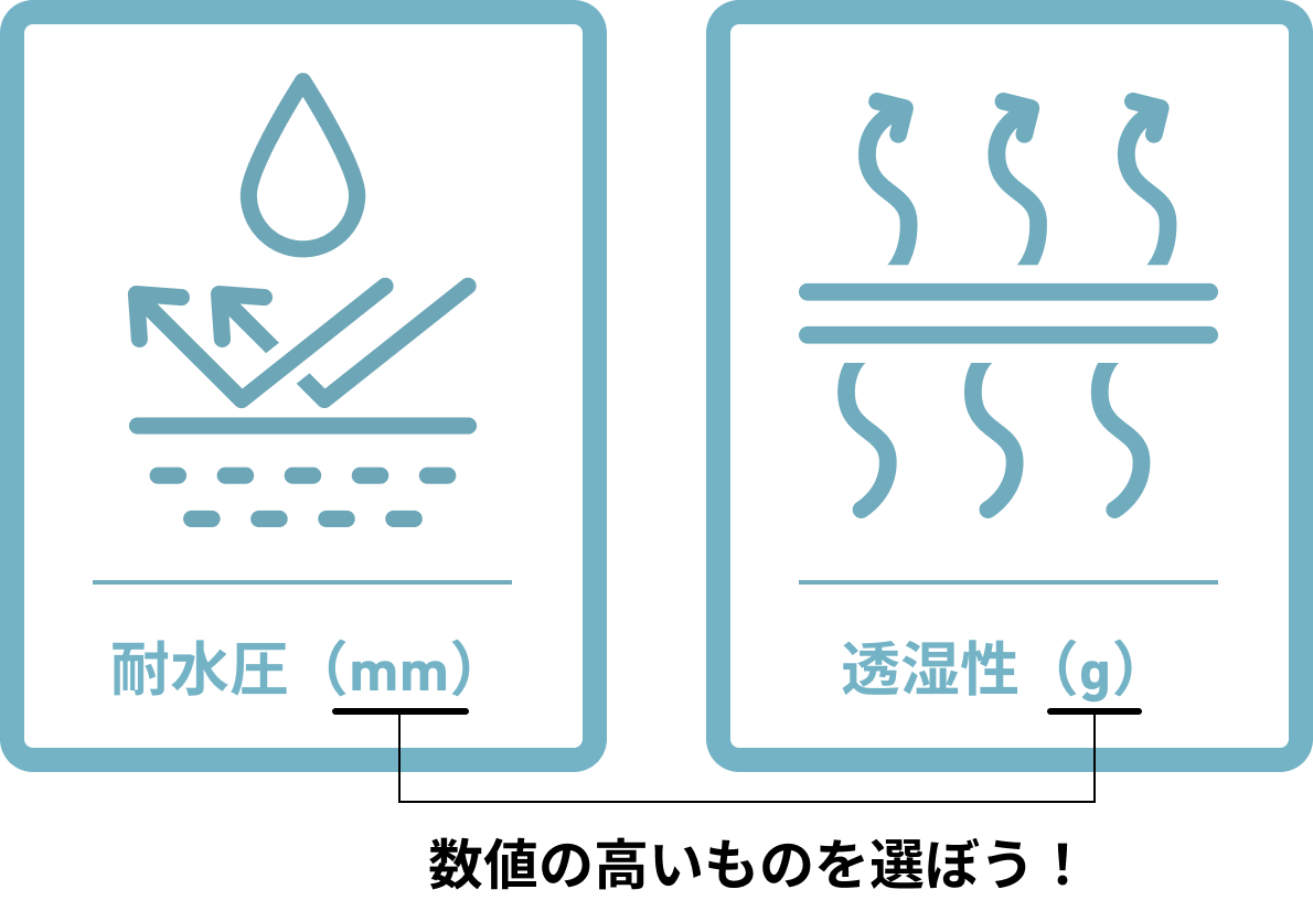 まずは、「耐水圧」」と「透湿性」。