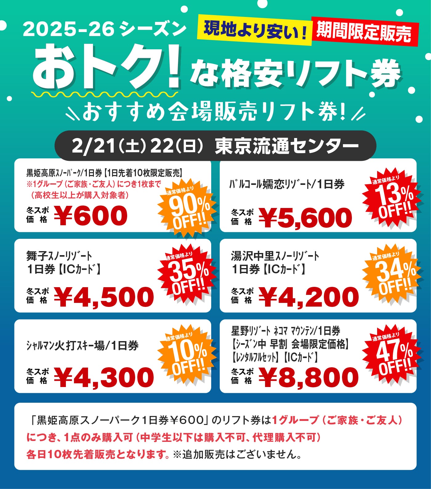 - 完売告知は会場内リフト券売場のみとなりますので、予めご了承ください。